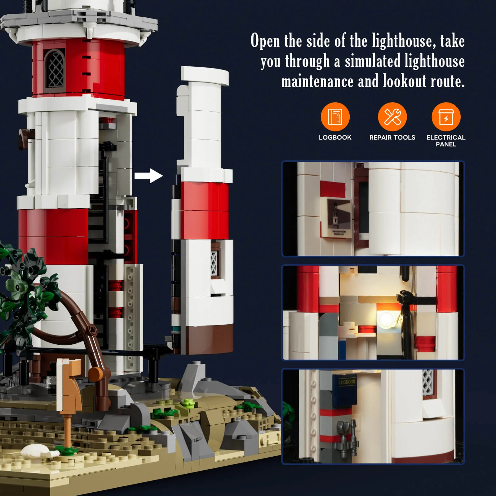 Dankzij het handige zij-open ontwerp kun je de vuurtoren in één beweging openklappen. Het interieur bestaat uit meerdere lagen waar minifiguren de typische inspectie- en uitkijkroutes volgen.